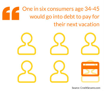 Takeaway #2: The sandwich generation is less worried about lengthier repayment. Nearly 13 percent of individuals 35 to 44 are prepared to repay vacation-related credit card debt with time, compared with under 10 % of those 45 to 54.