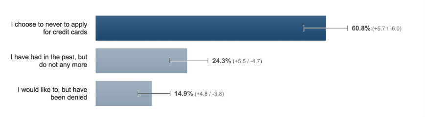 Credit Sesame also discovered that 70 percent of those who will have credit cards don't trust credit card issuers and most 50 % asserted banks are simply not friendly. Another reason why this group remains strongly against credit cards is because they are concerned about accumulating debt.
