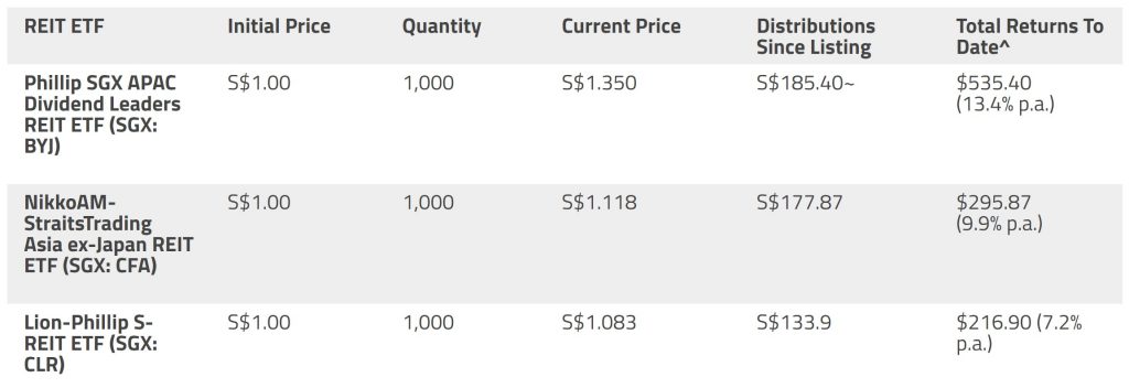 ^ Total Returns include the capital gains if you sold the shares and also the distributions accumulated since the shares were purchased at listing. Per annum return is computed by total returns divided by number of years since listing (i.e. Four years for SGX:BYJ and 3 years for SGX:CFA and SGX:CLR)