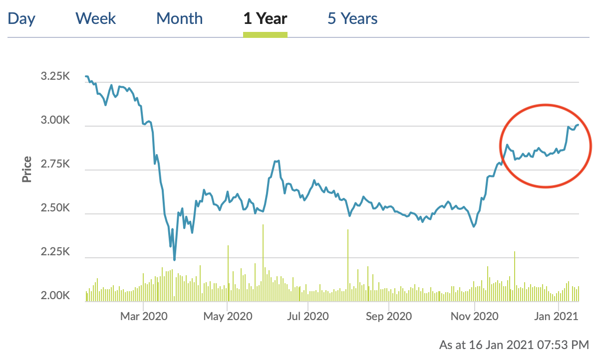 Between December 2021 and 15 January 2021, Wilmar posted a share price gain of 24.0% to $5.22, from $4.21. This was a 3.5 times outperformance of the STI return during the same period.