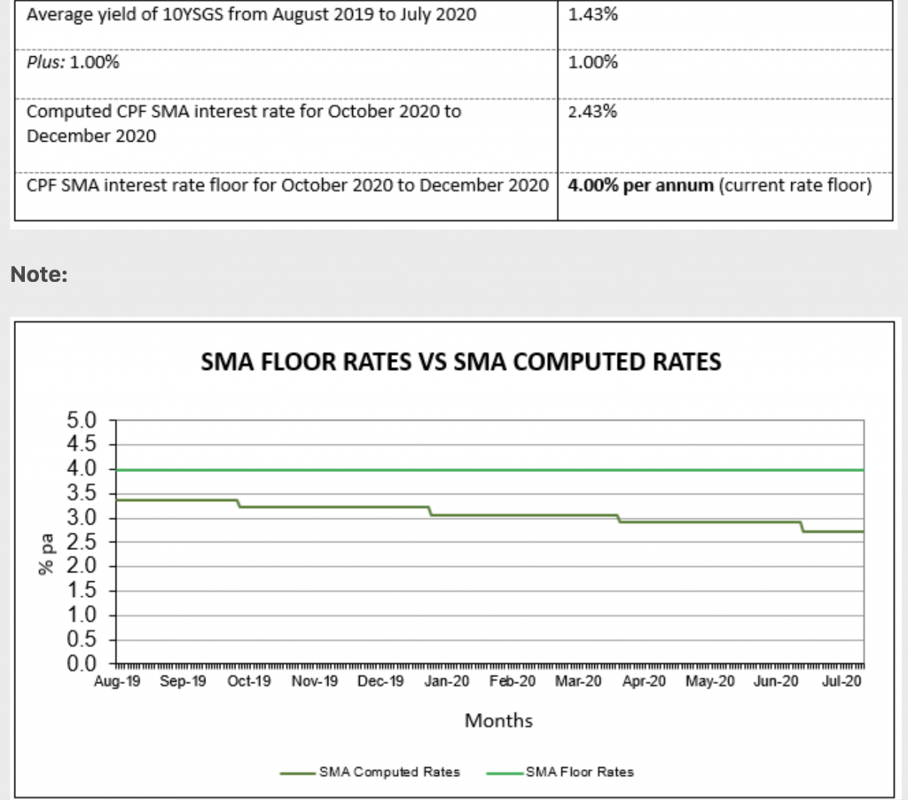 For the Special Account, MediSave Account and Retirement Account, commonly referred to as SMRA, there is no legislated floor rate above the 2.5% level. Since 1 January 2008, the government pegged the interest rates on these accounts to instruments concentrating on the same risks – the 12-month average yield from the 10-year Singapore Government Securities plus 1%. Simultaneously, the government also committed to providing a floor rate of 4.0% on the SMRA accounts. It has been ongoing, and the comments are meant to inform us that the floor rate continues. In CPF's latest announcement, the ground rate will be extended to 31 December 2021.
