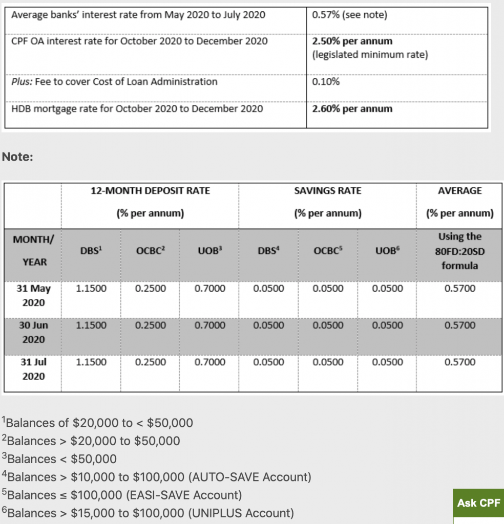 | Ordinary Account (OA) | 80% : 20% fixed deposit to savings rate of preceding 3-month average of major local banks' interest rates | 2.5% per annum | Quarterly |