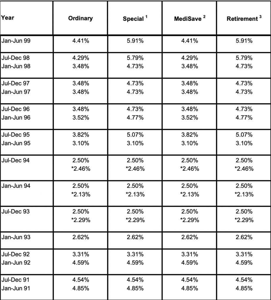 | Special Account (SA) | 12-month average yield of 10-year Singapore Government Securities plus 1% | 4.0% per annum | Quarterly |