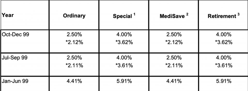 From 1 July 1998 to at least one October 2001, the MediSave Account was not part of the government commitment to pay a floor rate of 4.0%. The government had only dedicated to paying an additional 1.5%, on top of the Ordinary Account interest, on our Special Account and Retirement Account. At the time, the only thing protecting our MediSave Account interest returns was the legislated minimum of 2.5% to be paid on our CPF savings.