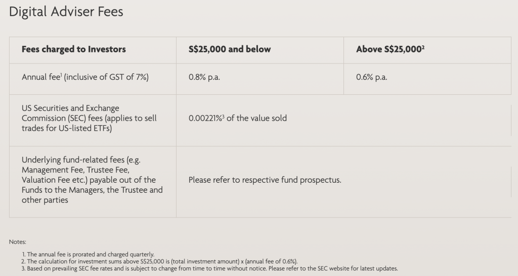 Fees for UOBAM Invest is 0.8% p.a. in case your account balance is below $25,000 and below and 0.6% p.a. in case your account balance is above $25,000. For example, if your portfolio is $30,000, you pay 0.6% p.a. ($180 each year) on the entire sum rather than charging a higher rate on the first $25,000. Fees are including the 7% GST but excluding SEC fees, which is charged when an investor's portfolio transacts on US-listed ETFs and underlying fund-level fees.