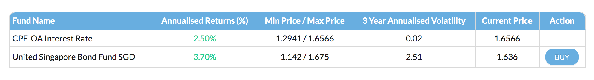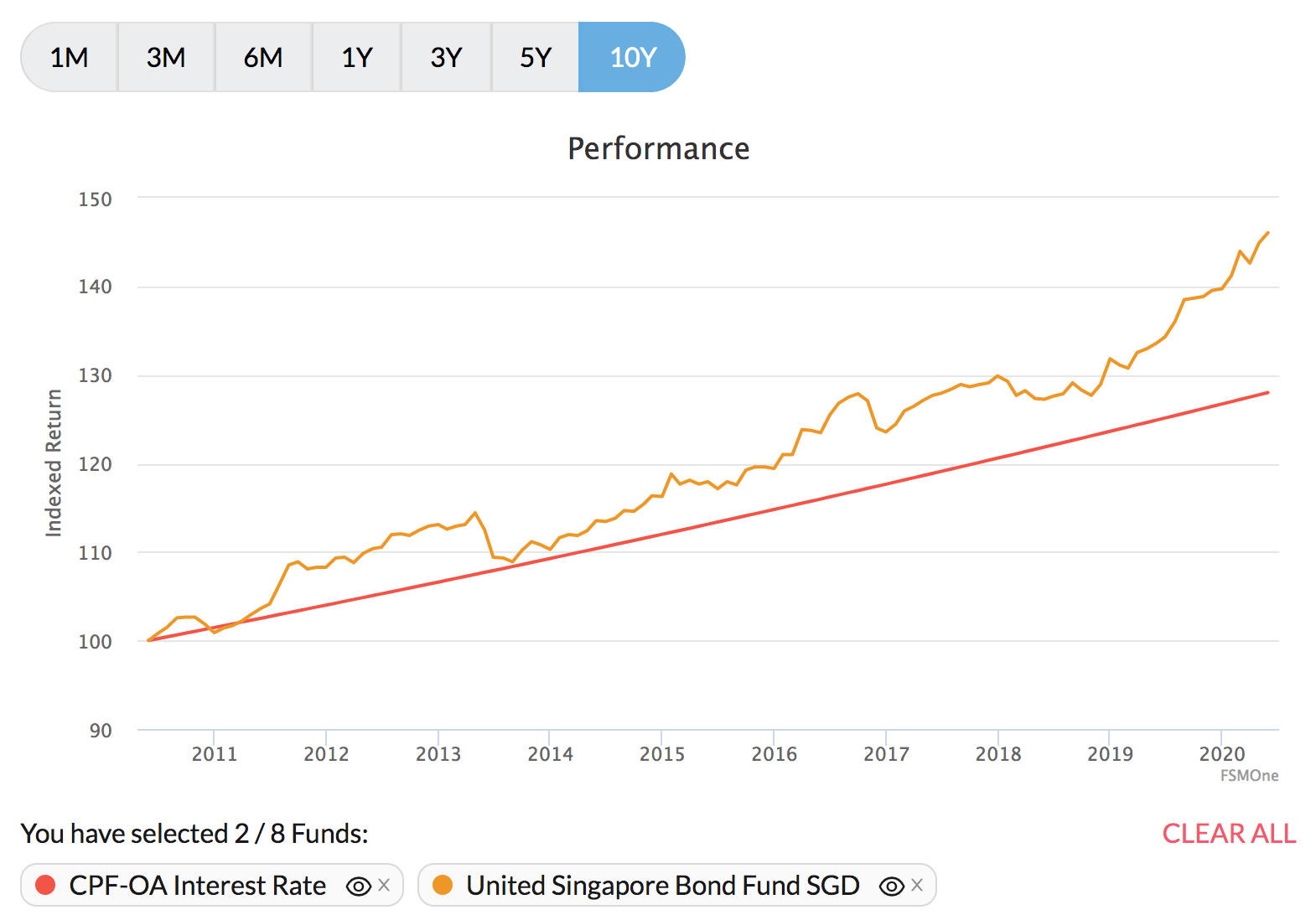 For example, when we compare the United Singapore Bond Fund, a fund that has been incepted since 2004 and invests mainly in bonds denominated in Singapore Dollars, we can see that it has outperformed the 2.5% risk-free returns that we would have earned from our CPF Ordinary Account (OA).