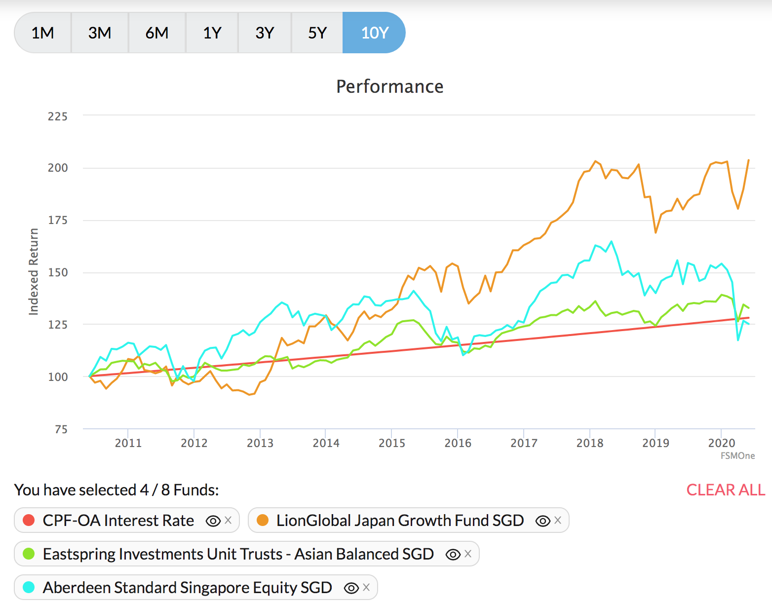 Low-risk funds will expose us to lower volatility, but our returns could be lower. On the other hand, higher-risk funds may potentially give us a much higher performance, however it might also decline in value during major recessions. As CPF members, we need to be mindful of the risk-return trade-offs that we face.
