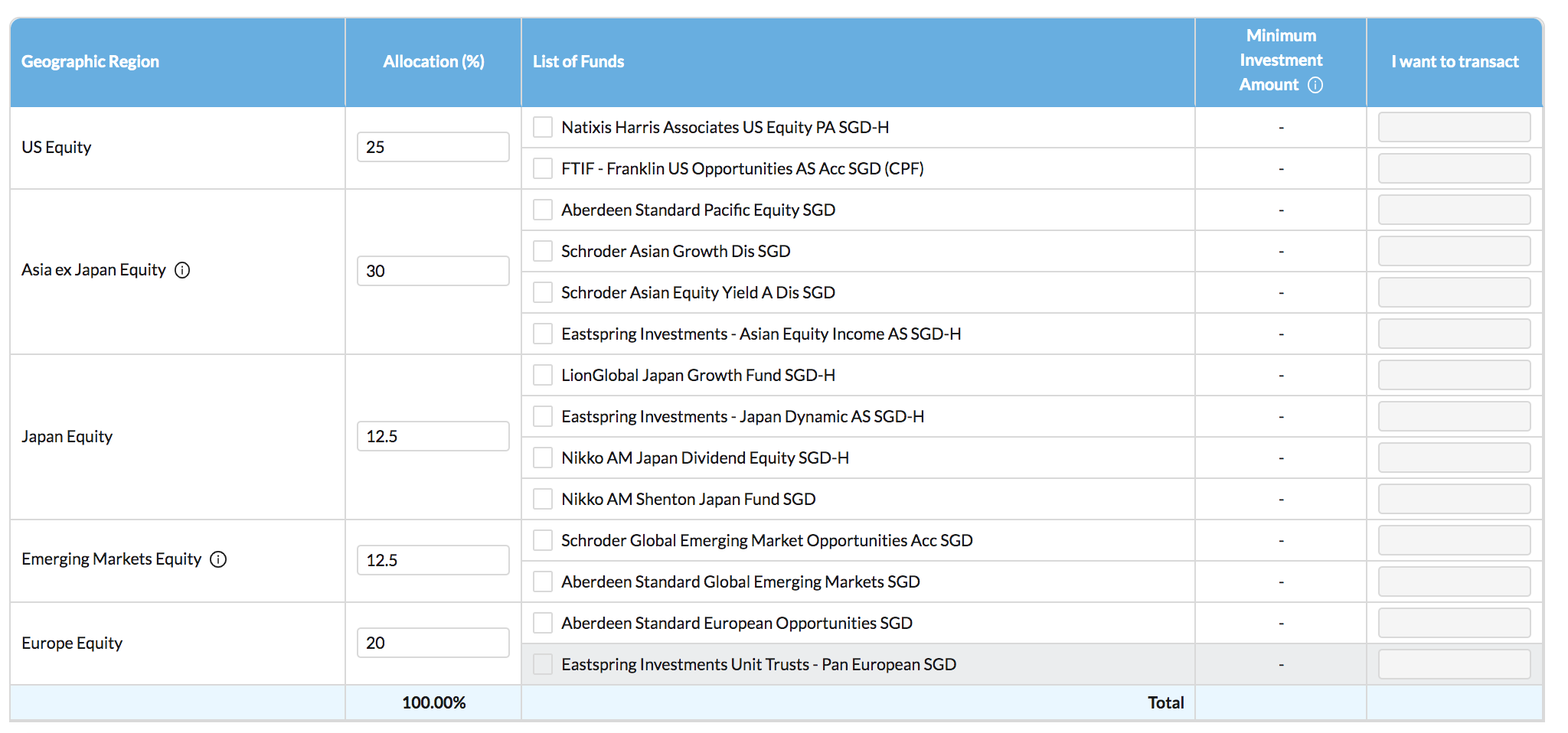 For example, you could have 25% of the portfolio in US, 30% in Asia (excluding Japan), 12.5% in Japan, 20% in Europe and the remaining 12.5% of your portfolio in Emerging Market equity. FSMOne also highlights a few of the unit trusts that you can invest in to gain the exposure to the regions you are looking for.