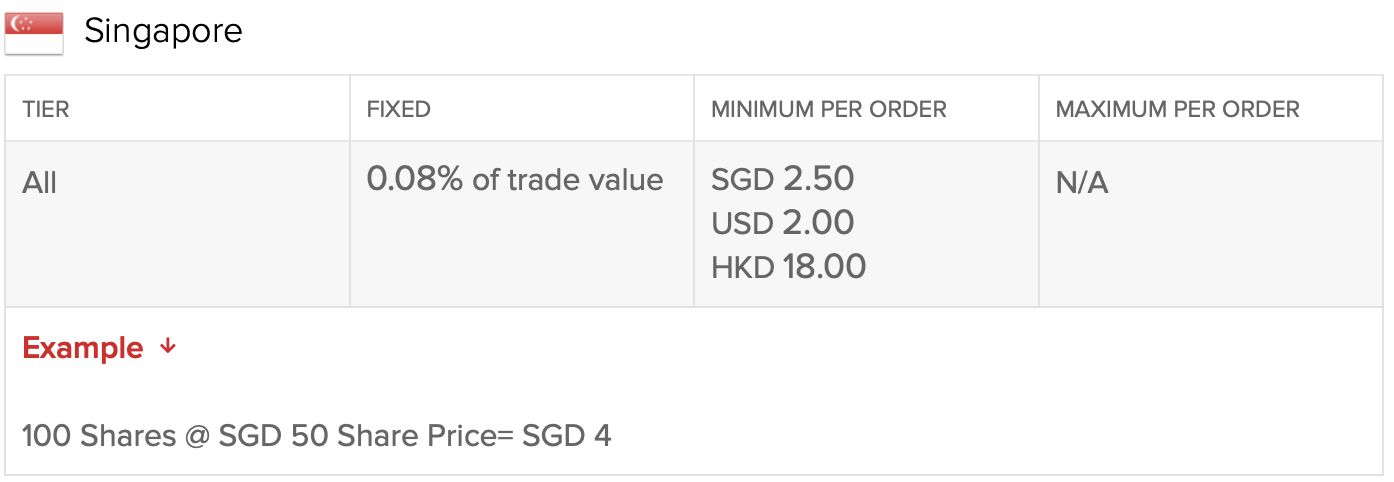 For stocks and other securities indexed by Singapore, there is a fixed brokerage commission of 0.08% of the trade value. There also doesn't appear to be a minimum brokerage fee which a number of other brokerages currently charge.