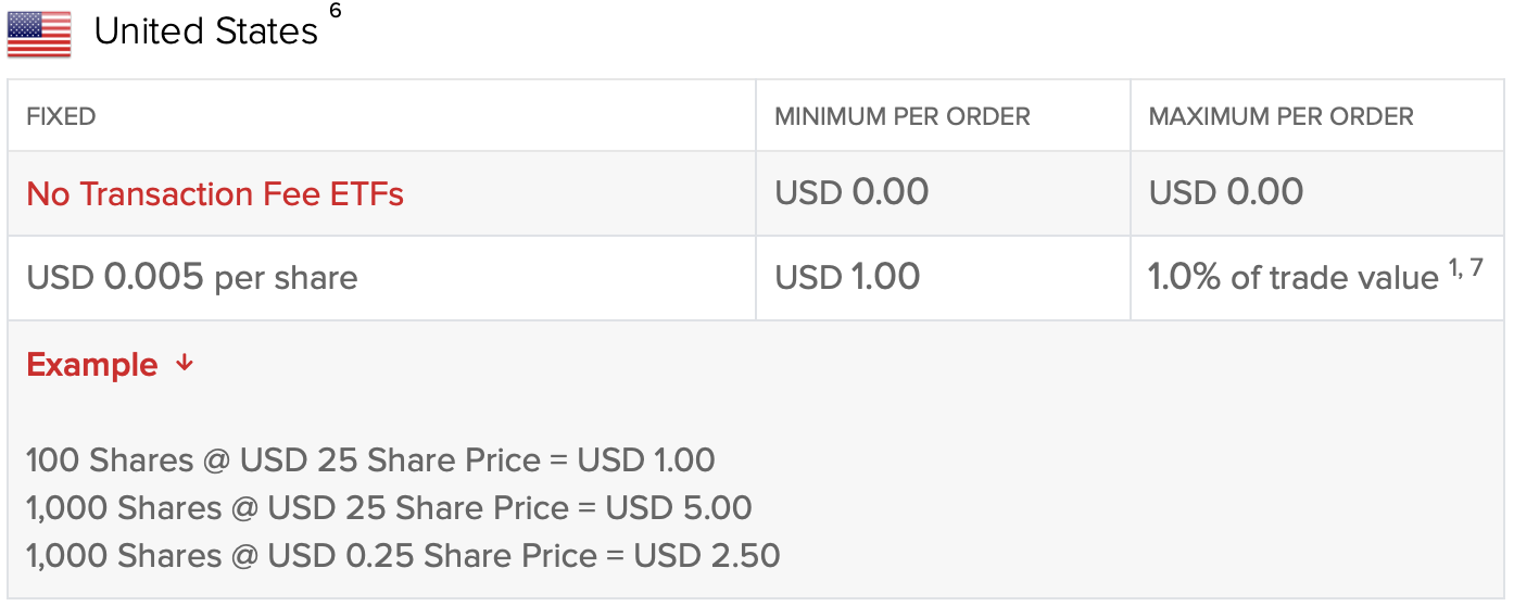 For ETFs listed in the US, it charges no transaction fees, and merely US$0.005 per share.