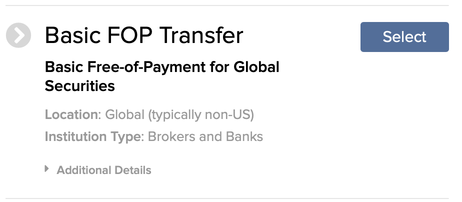 We can pick the Basic FOP Transfer option, which allows us to transfer our securities held in another custodian account in Singapore, or with another brokerage internationally, to Interactive Brokers, free-of-charge.