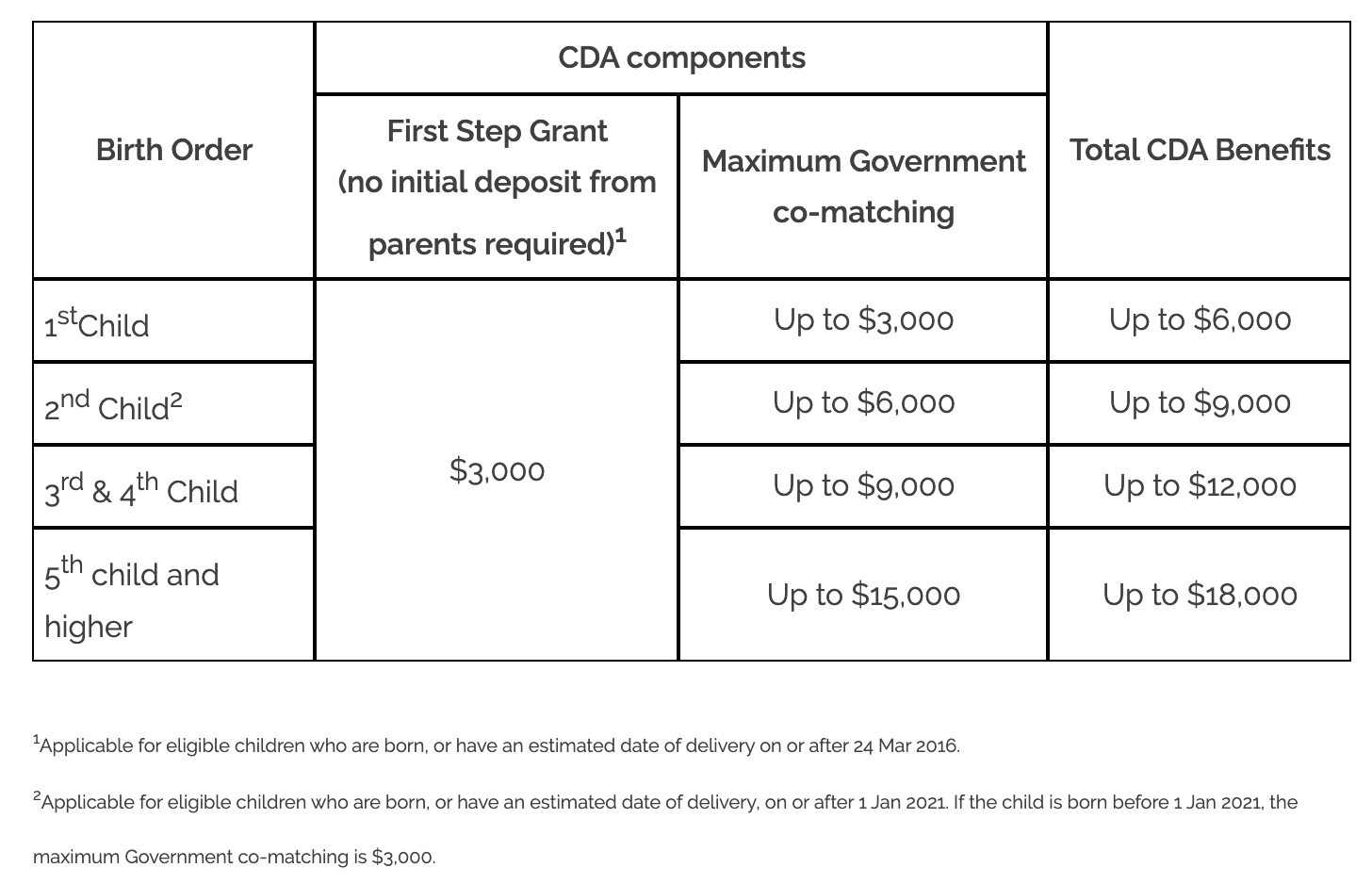 Do note that for Singapore Citizen children who are born between 17 August 2008 to 23 March 2021, the dollar-for-dollar matching in the government is higher by $3,000. That's because children born 23 March 2021 and earlier don't benefit from the initial $3,000 CDA First Step.