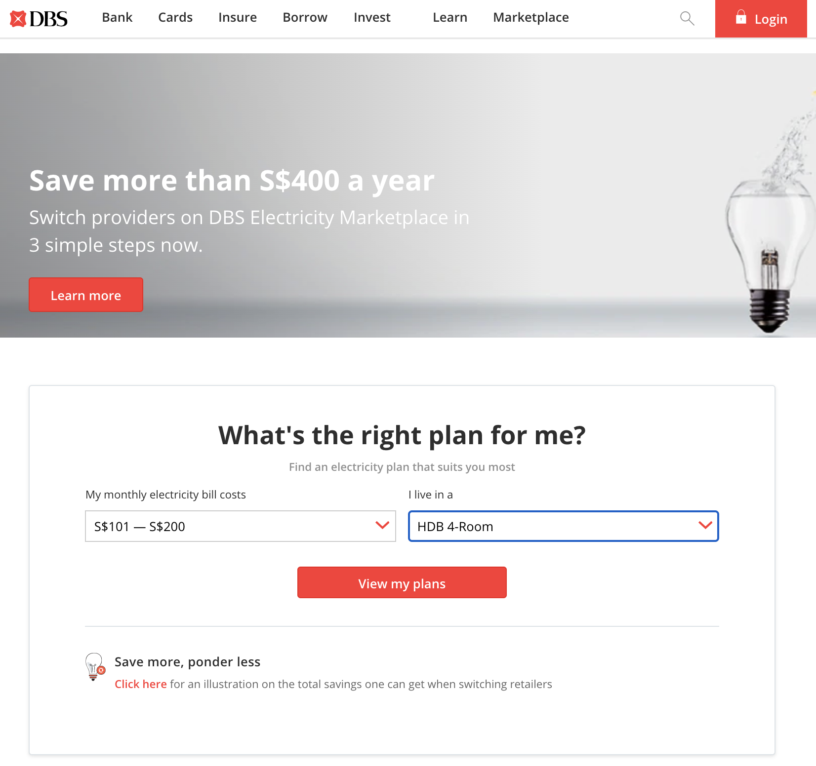 Through DBS Utility Marketplace, you can compare the prices being offered by different licensed electricity retailers. You may also filter for the best plans according to your choice, such as a fixed price, discount off tariff plan or you want your provider to become only using clean energy.