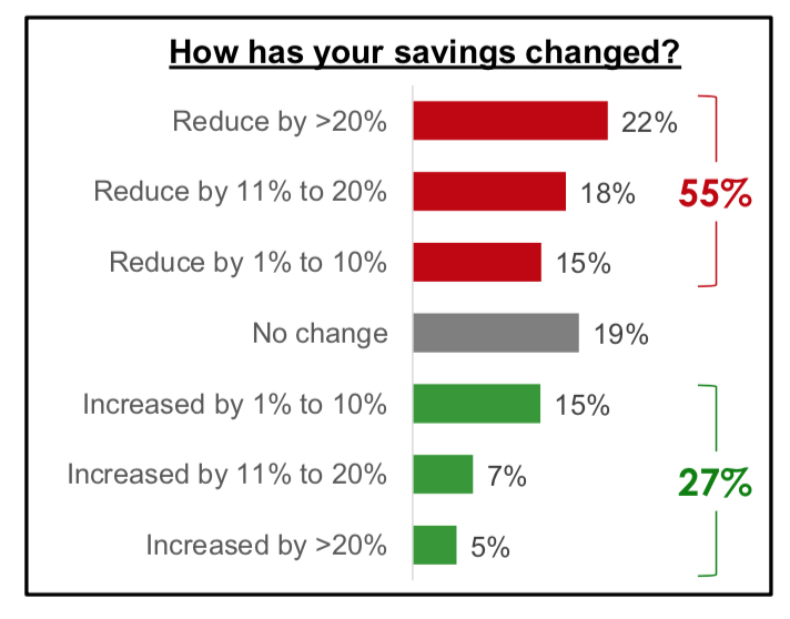 In the survey, 55% of respondents said they'd reduced their savings in the last months. We suspect this is because many respondents might have suffered a reduction in their income, making it difficult to spend less during this time period if their expenses remain the same.