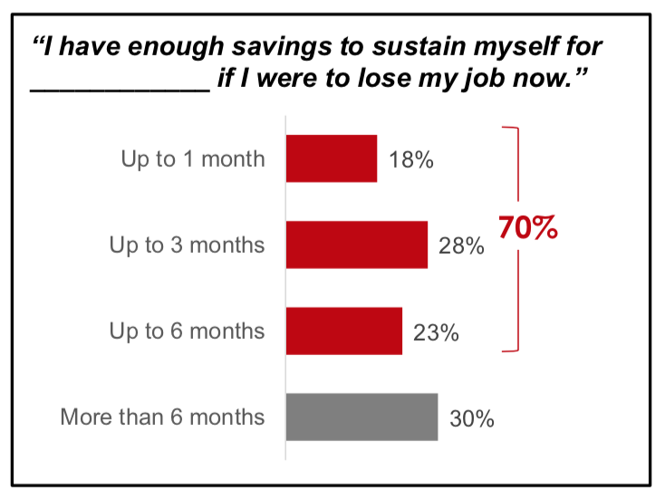 Unfortunately, the OCBC survey revealed that only 30% can sustain themselves for more than Six months if they would lose their job now. 18% admitted that they have enough savings to cover only up to 30 days of expenses. This doesn't bode well for his or her financial security.