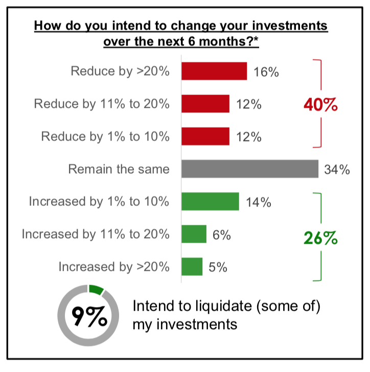 Unfortunately, but perhaps not surprisingly, the type of who have invested, 40% have asserted they plan to reduce their investments. 9% even admitted that they would be liquidating a few of their investments during this period.