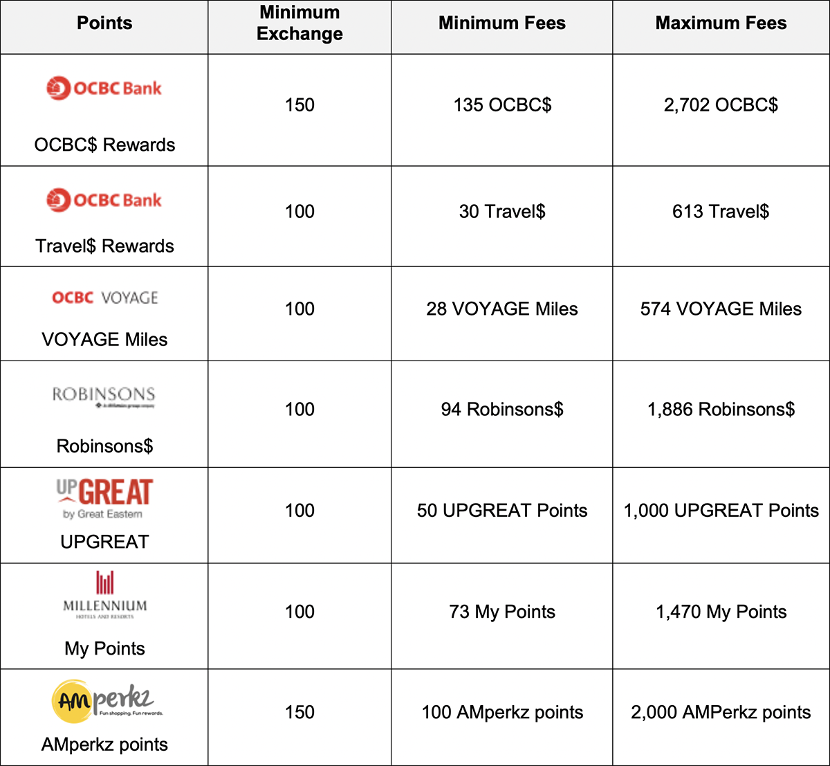 A 2% admin fee of the total value of the outgoing rewards points will be charged for every exchange transaction, with a minimum and maximum cap around the admin fee per transaction.