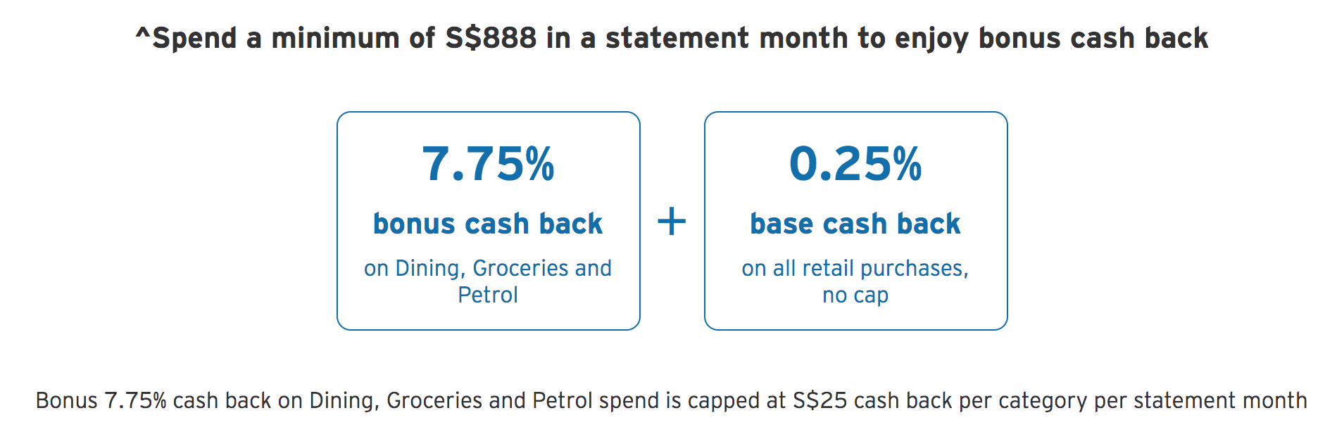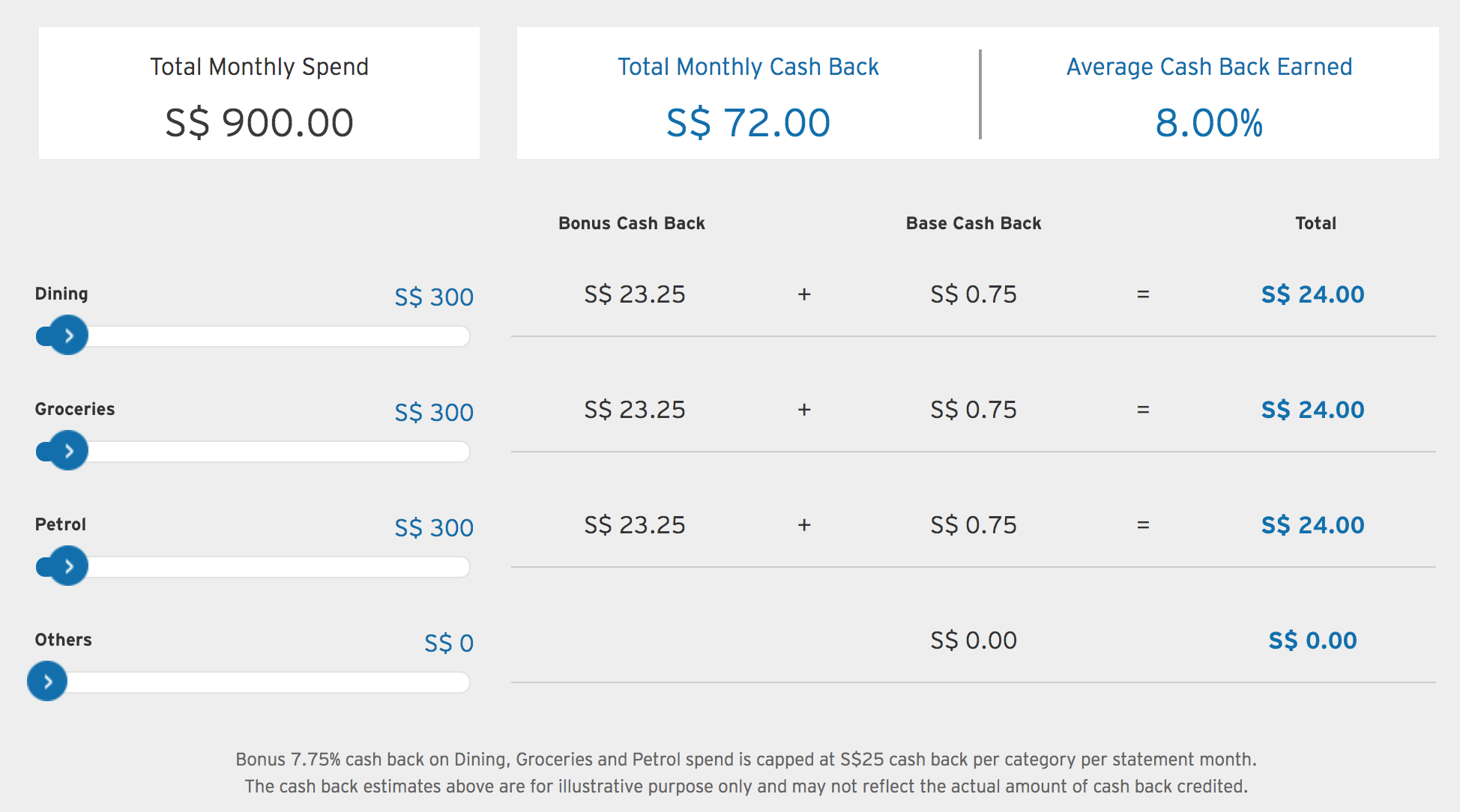 For example, should you spend about $300 per month on groceries, $300 on dining and $300 on petrol, you will spend $900 each month. This provides you a base cash return of $2.25. (0.25%). Additionally you entitled to the bonus 7.75% cash return since you have spent more than $888 for the month. This allows you to earn a cash return of $23.25 (7.75% of $300) for every category.